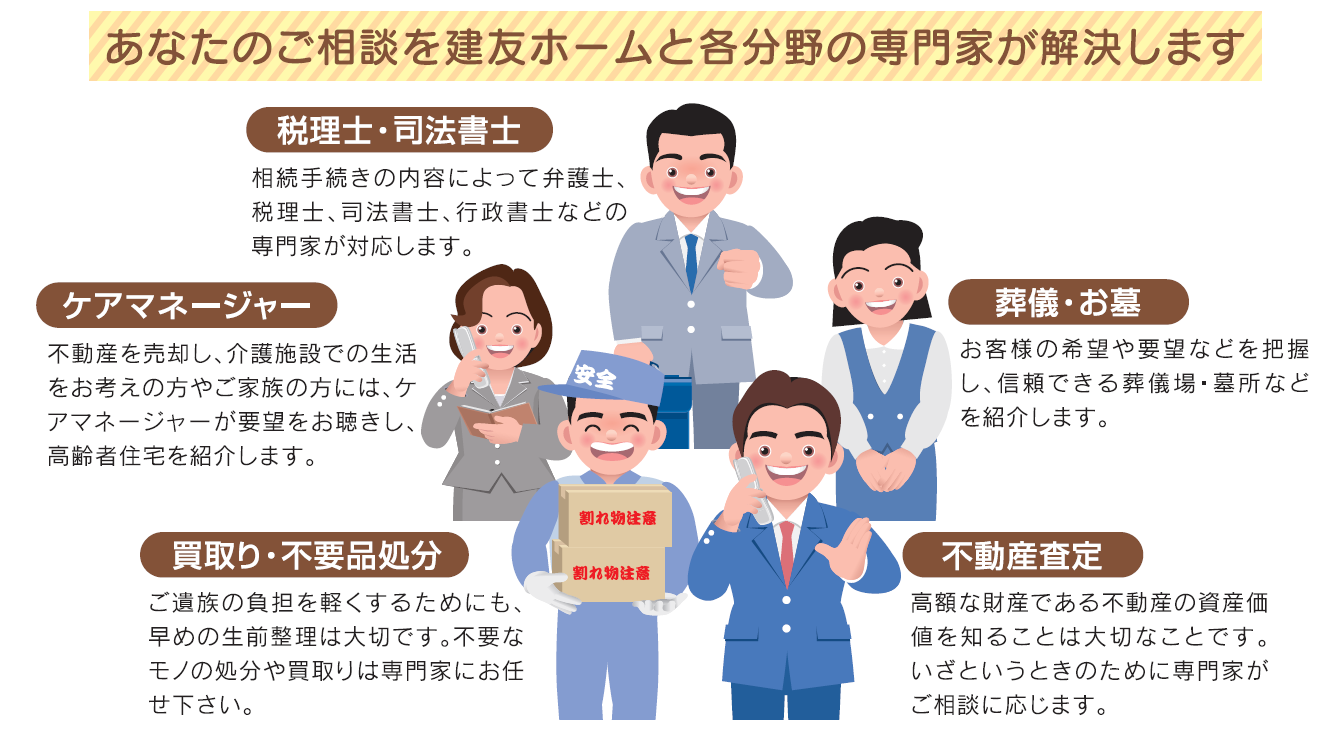 各分野の専門家と連携し、終活のアドバイスとサポートを行っております。